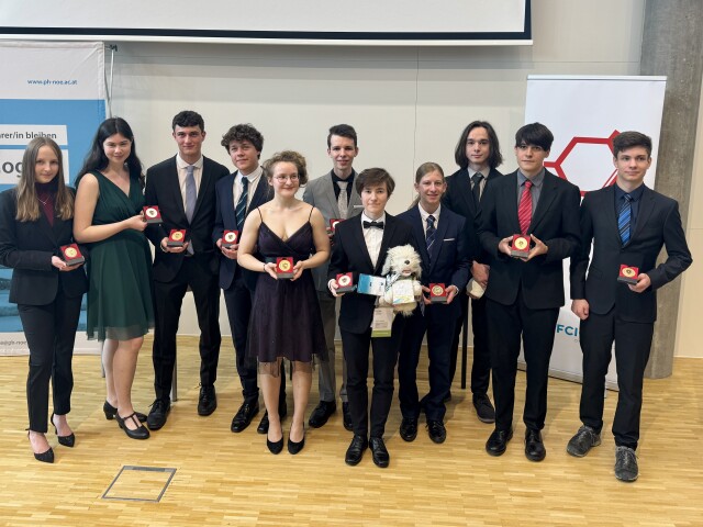 Mit der Siegerehrung im Hörsaal "Aequalitas" der PH Niederösterreich in Baden ist am 28.5.25 der Bundeswettbewerb der 51. Österreichischen Chemieolympiade zu Ende gegangen.