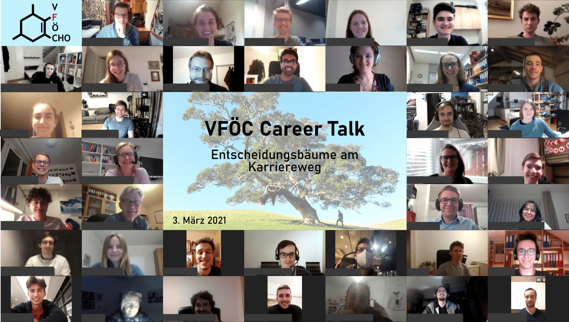 Unter die Kategorie der sehr gelungenen Veranstaltungen fällt wohl der VFÖC Online Career Talk am 3.3.2021. In einer von Obmann Sebastian Hecko moderierten Diskussion wurden von vier ChemikerInnen mögliche Karrierewege ausgehend von einem Chemiestudium beleuchtet. Ruth Birner-Grünberger (University Professor – TU Wien) skizzierte den Pfad durch die Unikarriere, während Manfred Kerschbaumer (ehem. AHS Lehrer & External Lecturer – IMC Krems) ein Plädoyer für das Lehrertum hielt. Gerit Pototschnig (Research Scientist – Elli Lilly, CA USA) erläuterte die Wichtigkeit von Auslandserfahrungen zur Persönlichkeitsentwicklung und Michael Schön (Division Production Officer- Romer Labs, Tulln) zeigte auf, dass der Gang in die Industrie eine vielversprechende Perspektive ist. Unter anderem wurde über Mentoring, Softskills, Glück bei Entscheidungen, den Nutzen des Doktorats und den Einfluss von Familie/FreundInnen/WegbegleiterInnen ausführlich diskutiert. Wir freuen uns besonders, dass auch einige SchülerInnen unter den ZuhörerInnen waren und wir somit die Schallmauer von 50 TeilnehmerInnen an einem Vereinsevent erstmalig durchbrechen konnten.