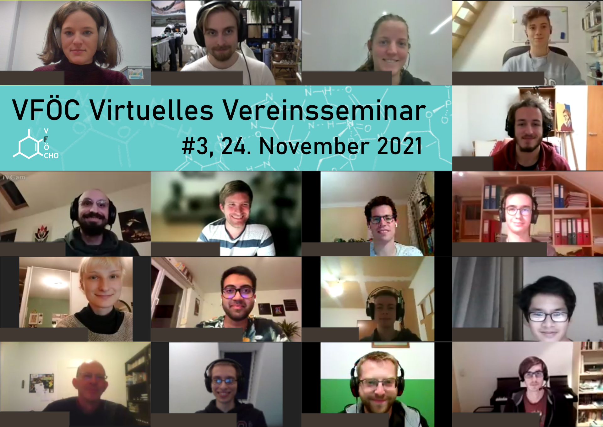 Die bereits 3. Ausgabe des VFÖC Online-Vereinsseminar fand am 24.11.2021 statt – und bot damit eine ideale Ablenkung vom kurz zuvor in Kraft getretenen Lockdown in Österreich. Es gab erneut ein gemischt-chemisches Programm mit vier Vorträgen aus verschiedenen Bereichen: Begonnen wurde das Seminar mit einem kurzen Ausflug in die Verfahrungstechnik und die Charakterisierung von Extrakten, gefolgt von einem Überblick über neue Trends in der reduktiven Funktionalisierung von Heteroaromaten. In der zweiten Hälfte wurde den anwesenden Mitgliedern zunächst die komplexe Welt der EPR Spektroskopie nähergebracht, bevor sie sich einmal mehr in diesem Jahr mit Clustern beschäftigen mussten – dieses Mal aber in Nanometergröße und aus Gold. Wie bereits bei den letzten zwei Seminaren wurden auch dieses Mal viele Fragen gestellt und es kamen spannende Diskussionen zustande. Wir freuen uns schon auf die nächste Ausgabe!